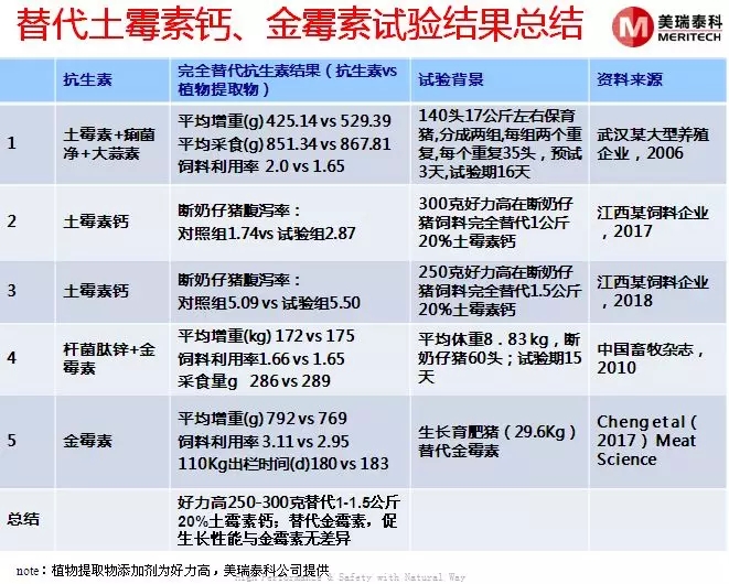 十二年之前成立的美瑞泰科,作为“减抗替抗的践行者”,已经主办或赞助了近百场无抗技术与推广会议,并与国内外60%以上的优秀企业保持良好的合作。在国内外培养了30多名硕士博士研究生,并发表了近50篇SCI研究文章和获得了20多项国家发明专利!本次会议中公司技术副总监杨江涛硕士总结了美瑞泰科旗舰产品好力高在无抗中的研究总结,从早期替代一个抗生素如硫酸粘杆菌素,到近几年来逐步替代2-3个抗生素如土霉素钙和金霉素等,和欧洲试验与实践完全替代抗生素,都取得了满意的效果(下图)。