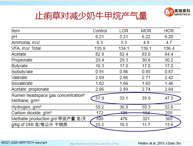 金博士指出,反刍动物生产过程产生的的碳排放据统计占了整体碳排放的10%以上,是碳排放的主要贡献者之一。引起反刍动物碳排放高的主要原因是瘤胃中的古菌(产甲烷菌)产生大量甲烷气体并通过动物的反刍作用以嗳气形式排放到大气中。美国宾夕法尼亚州立大学Hristov教授领导的研究小组发现,奶牛饲料中添加止痢草提取物,可以有效减少瘤胃甲烷的产生(第一项研究减少40%;第二项研究减少27%)。并且在两项研究中对高产奶牛的产奶量均提高4%。通过体外实验发现,止痢草提取物可以有效抑制古菌(产甲烷菌)的生长。欧洲Ilias博士的研究也发现,止痢草提取物(好力高)可以提高奶山羊的产奶量,并减少奶中白细胞数量。